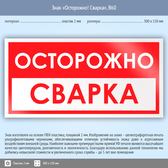 Знак «Осторожно! Сварка», B60 (пластик, 300х150 мм) в Бердске купить