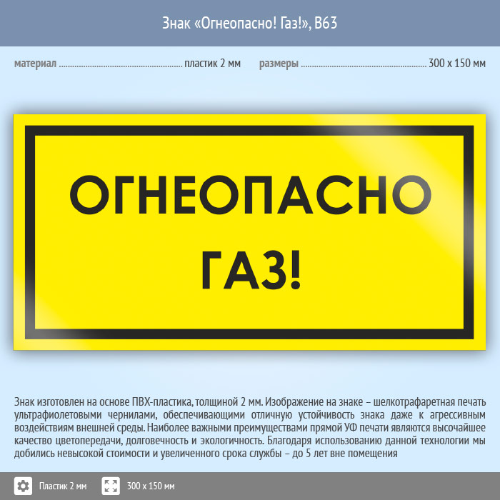 Знак «Огнеопасно! Газ!», B63 (пластик, 300х150 мм) в Бердске купить