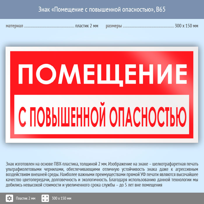 Знак «Помещение с повышенной опасностью», B65 (пластик, 300х150 мм) в Бердске купить