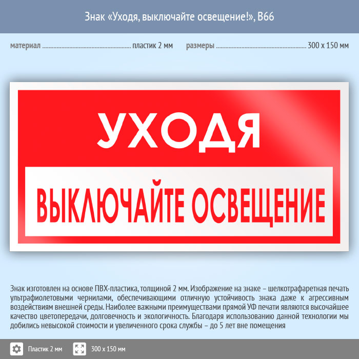 Знак «Уходя, выключайте освещение!», B66 (пластик, 300х150 мм) в Бердске купить
