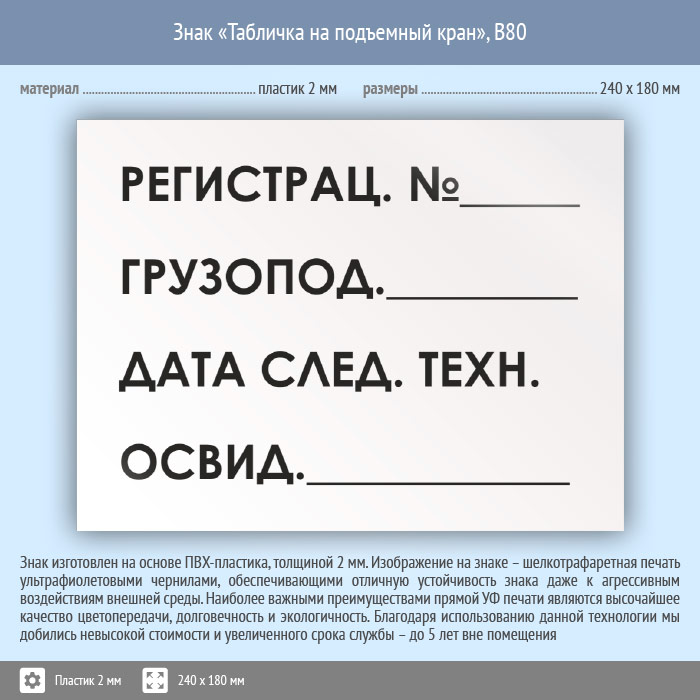 Знак «Табличка на подъемный кран», B80 (пластик, 240х180 мм) в Бердске купить