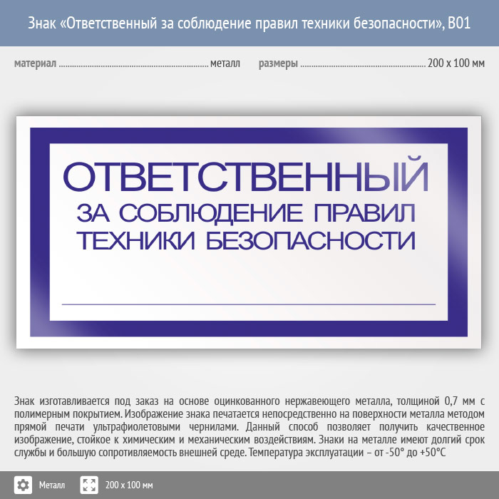 Знак «Ответственный за соблюдение правил техники безопасности», B01 (металл, 200х100 мм) в Бердске купить