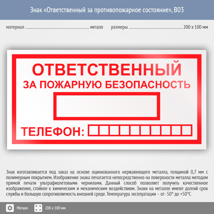Знак «Ответственный за пожарную безопасность», B03 (металл, 200х100 мм) в Бердске купить