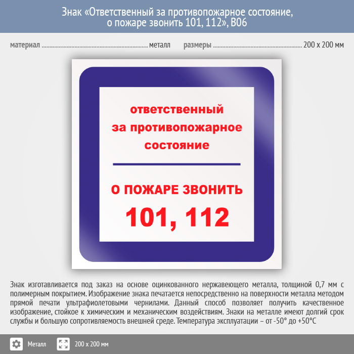 Знак «Ответственный за противопожарное состояние, о пожаре звонить 101, 112», B06 (металл, 200х200 мм) в Бердске купить