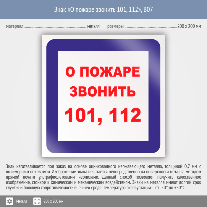 Знак «О пожаре звонить 101, 112», B07 (металл, 200х200 мм) в Бердске купить