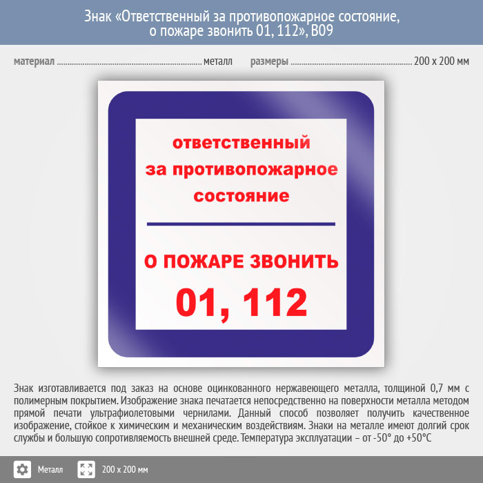 Знак «Ответственный за противопожарное состояние, о пожаре звонить 01, 112», B09 (металл, 200х200 мм) в Бердске купить
