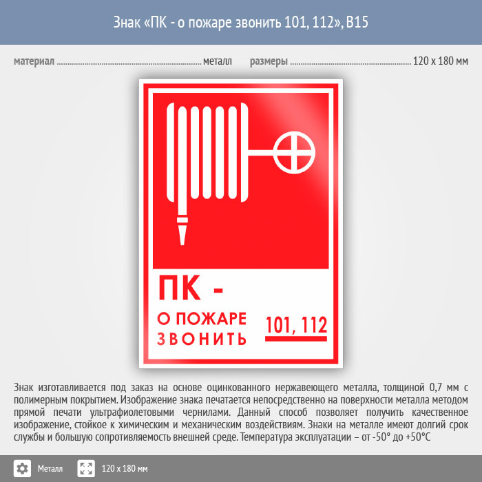 Знак «ПК - о пожаре звонить 101, 112», B15 (металл, 120х180 мм) в Бердске купить