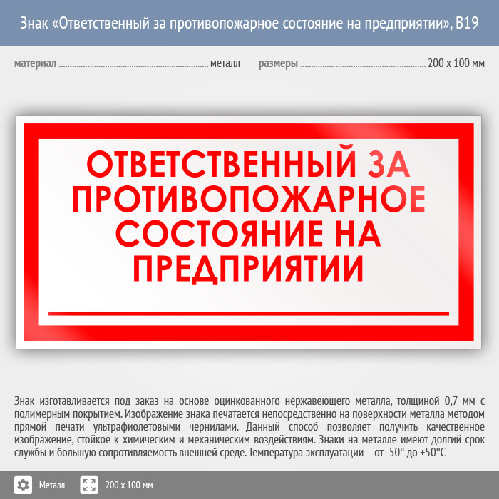 Знак «Ответственный за противопожарное состояние на предприятии», B19 (металл, 200х100 мм) в Бердске купить