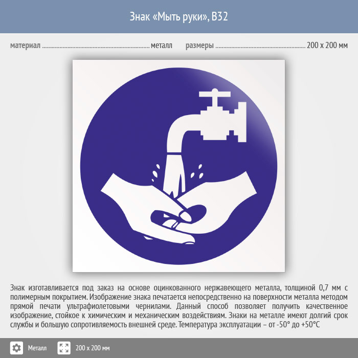 Знак «Мыть руки», B32 (металл, 200х200 мм) в Бердске купить