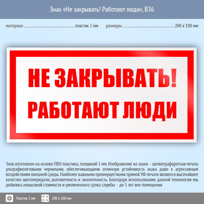 Знак «Не закрывать! Работают люди», B36 (пластик, 200х100 мм) в Бердске купить