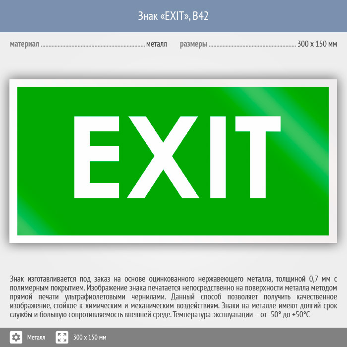 Знак «EXIT», B42 (металл, 300х150 мм) в Бердске купить