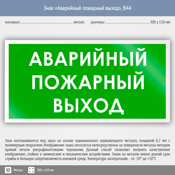 Знак «Аварийный пожарный выход», B44 (металл, 300х150 мм) в Бердске купить