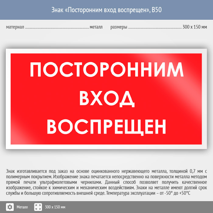 Знак «Посторонним вход воспрещен», B50 (металл, 300х150 мм) в Бердске купить