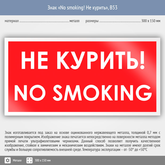 Знак «No smoking! Не курить», B53 (металл, 300х150 мм) в Бердске купить