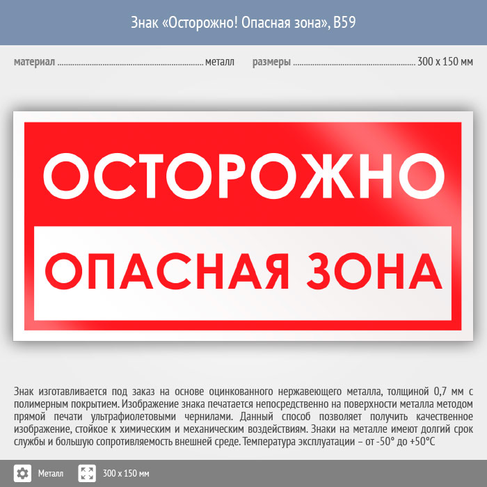 Знак «Осторожно! Опасная зона», B59 (металл, 300х150 мм) в Бердске купить
