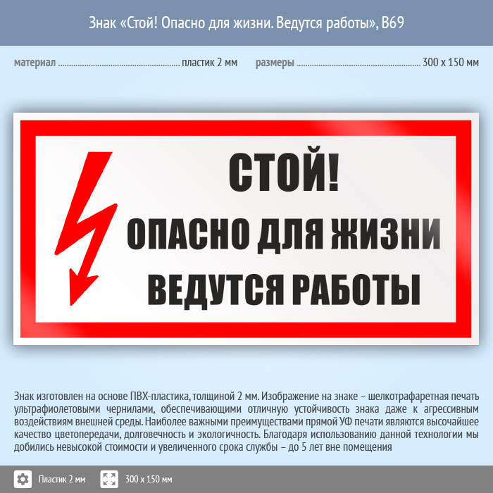 Знак «Стой! Опасно для жизни. Ведутся работы», B69 (пластик, 300х150 мм) в Бердске купить