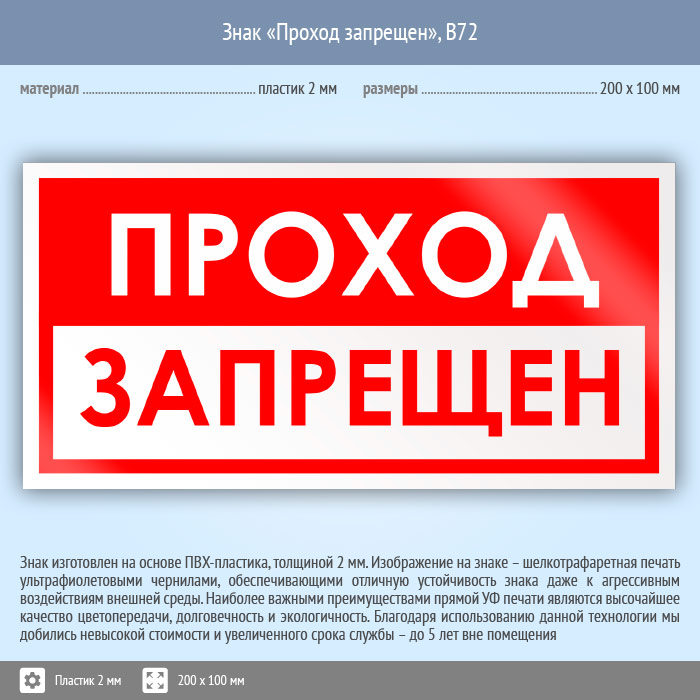 Знак «Проход запрещен», B72 (пластик, 200х100 мм) в Бердске купить