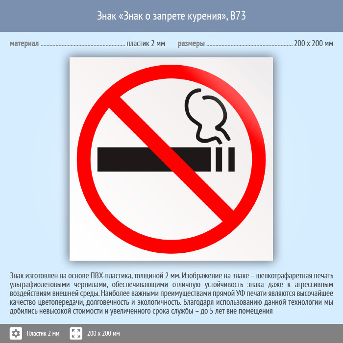 Знак «Знак о запрете курения», B73 (пластик, 200х200 мм) в Бердске купить