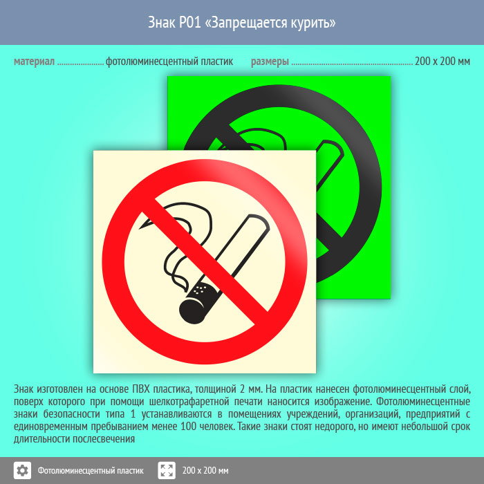 Знак P01 «Запрещается курить» (фотолюминесцентный пластик, 200х200 мм) в Бердске купить