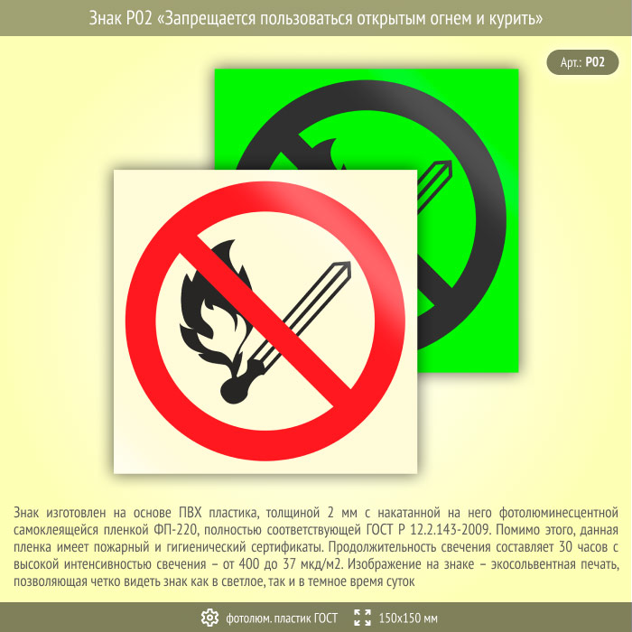 Знак P02 «Запрещается пользоваться открытым огнем и курить» (фотолюминесцентный пластик ГОСТ 34428-2018, 150х150 мм) в Бердске купить