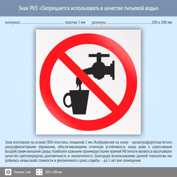 Знак P05 «Запрещается использовать в качестве питьевой воды» (пластик, 200х200 мм) в Бердске купить