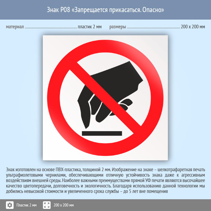 Знак P08 «Запрещается прикасаться. Опасно» (пластик, 200х200 мм) в Бердске купить