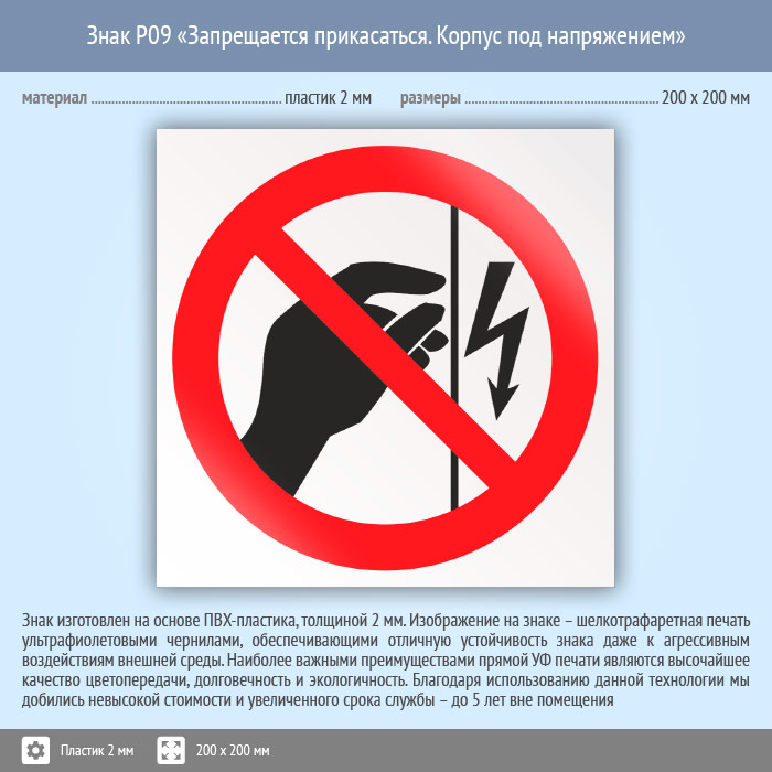 Знак P09 «Запрещается прикасаться. Корпус под напряжением» (пластик, 200х200 мм) в Бердске купить