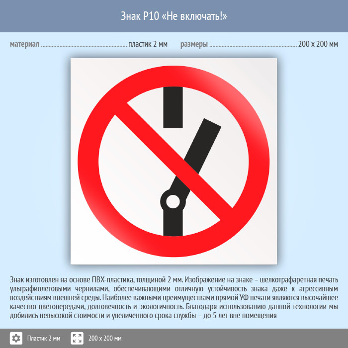 Знак P10 «Не включать!» (пластик, 200х200 мм) в Бердске купить