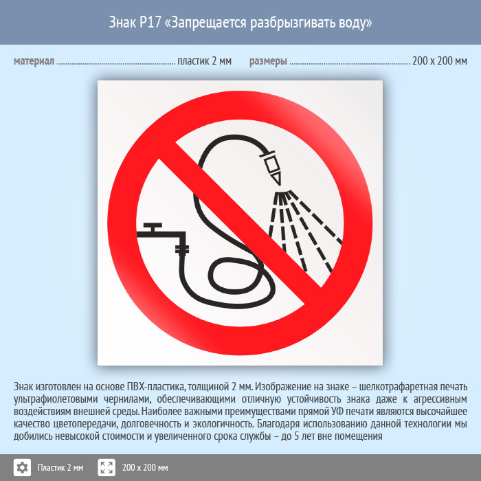 Знак P17 «Запрещается разбрызгивать воду» (пластик, 200х200 мм) в Бердске купить