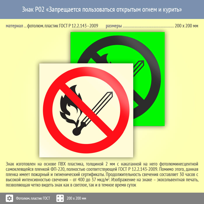 Знак P02 «Запрещается пользоваться открытым огнем и курить» (фотолюминесцентный пластик ГОСТ 34428-2018, 200х200 мм) в Бердске купить