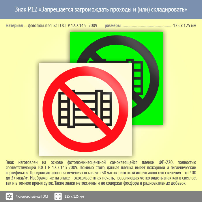 Знак P12 «Запрещается загромождать проходы и (или) складировать» (фотолюминесцентная пленка ГОСТ 34428-2018, 125х125 мм) в Бердске купить