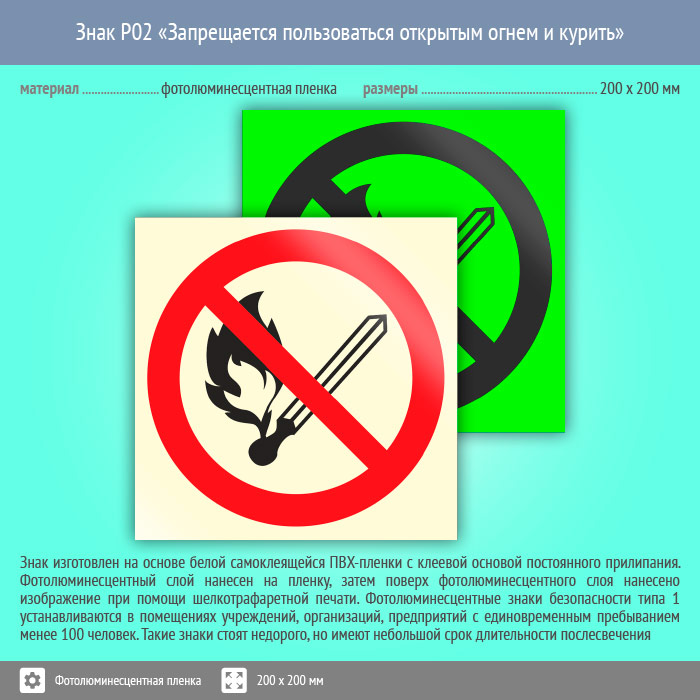 Знак P02 «Запрещается пользоваться открытым огнем и курить» (фотолюминесцентная пленка, 200х200 мм) в Бердске купить