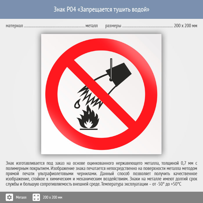 Знак P04 «Запрещается тушить водой» (металл, 200х200 мм) в Бердске купить