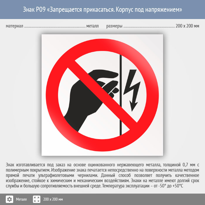 Знак P09 «Запрещается прикасаться. Корпус под напряжением» (металл, 200х200 мм) в Бердске купить