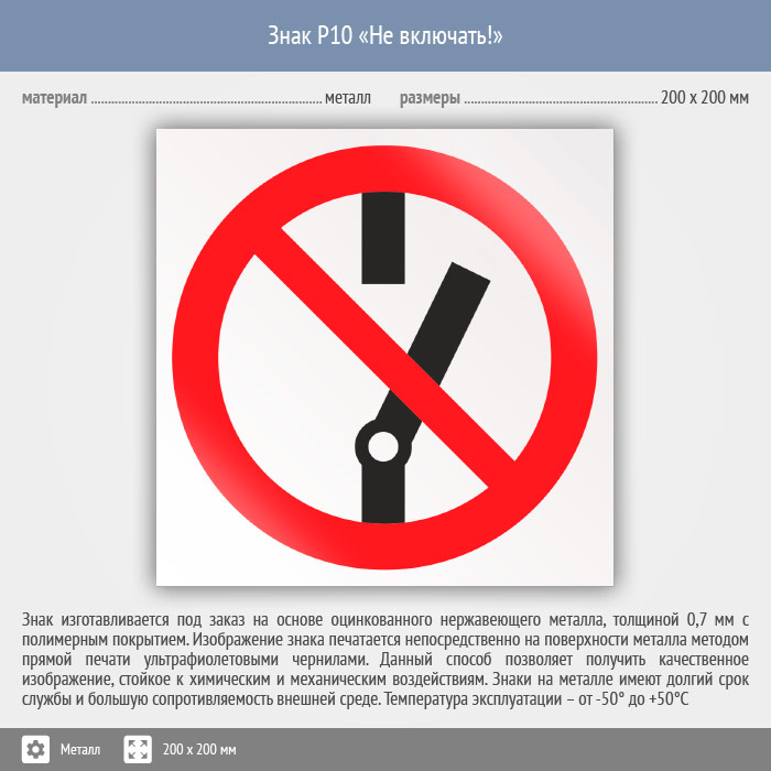 Знак P10 «Не включать!» (металл, 200х200 мм) в Бердске купить