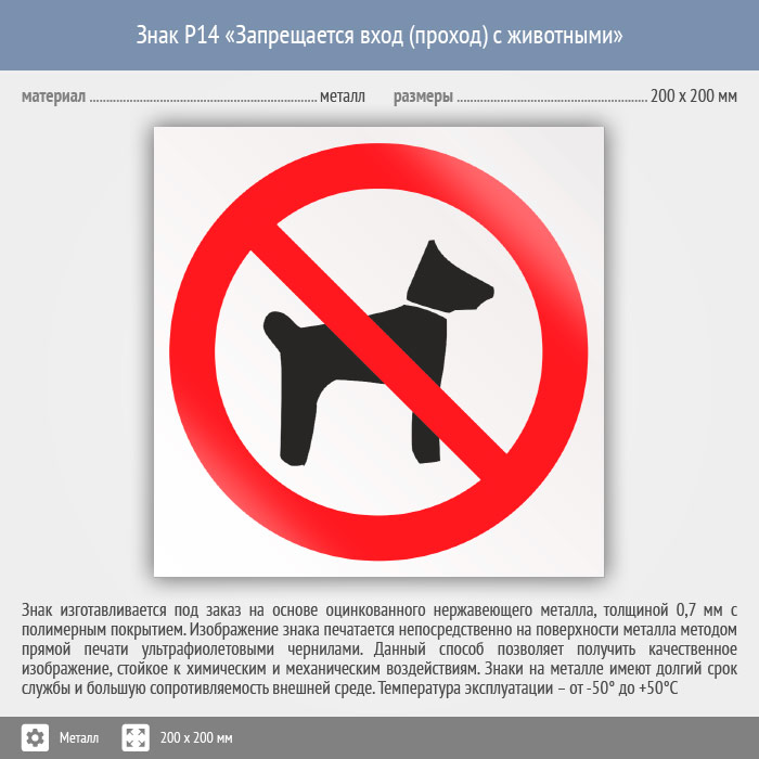 Знак P14 «Запрещается вход (проход) с животными» (металл, 200х200 мм) в Бердске купить