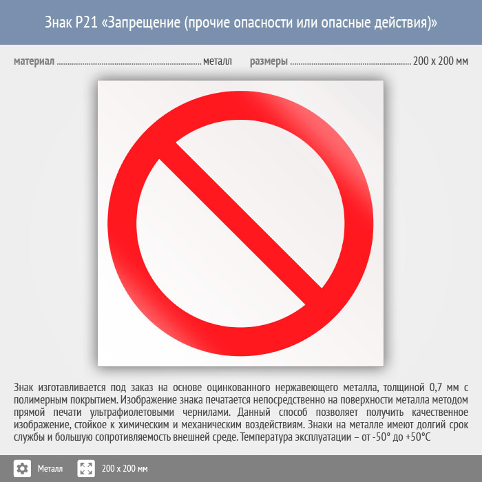 Знак P21 «запрещение (прочие опасности или опасные действия)» (металл, 200х200 мм) в Бердске купить