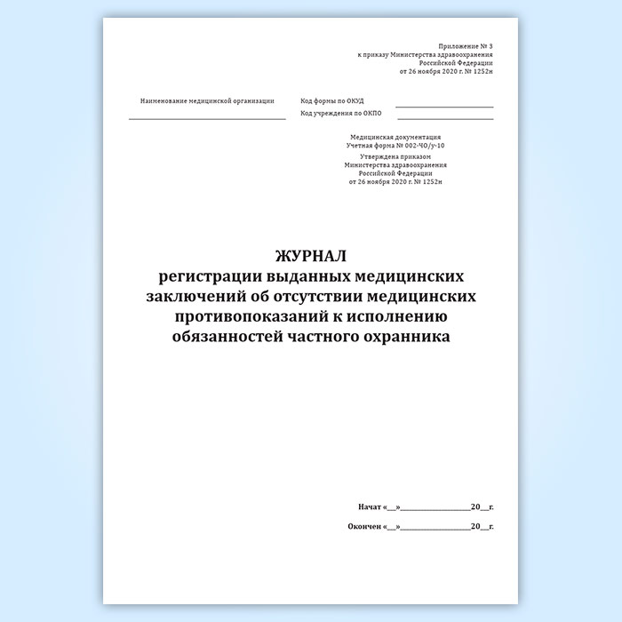 Журнал регистрации выданных медицинских заключений об отсутствии медицинских противопоказаний к исполнению обязанностей частного охранника (учетная форма № 002-ЧО/у-10) в Бердске купить