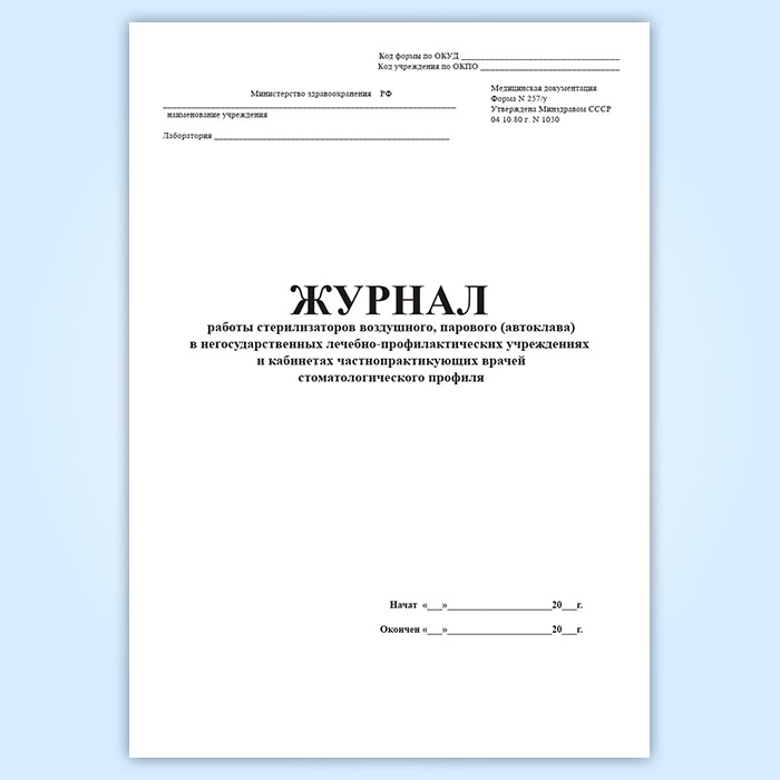 Журнал работы стерилизаторов воздушного, парового (автоклава) в негосударственных лечебно-профилактических учреждениях и кабинетах частнопрактикующих врачей стоматологического профиля (форма 257/у) в Бердске купить