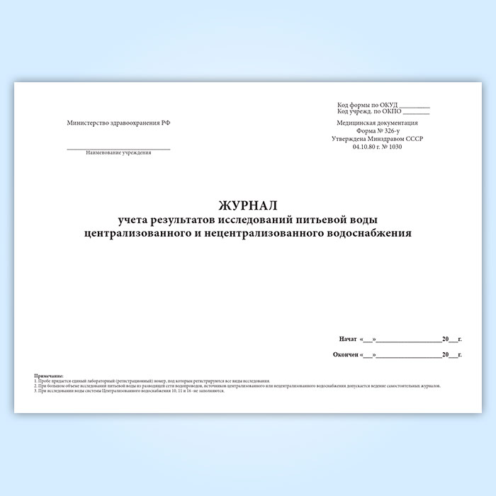 Журнал учета результатов исследований питьевой воды централизованного и нецентрализованного водоснабжения (форма 326-у) в Бердске купить