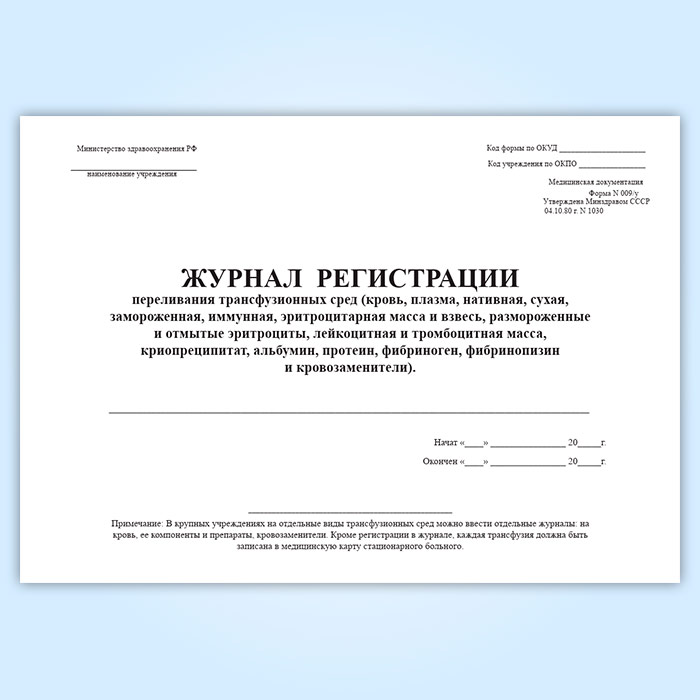 Журнал регистрации переливания трансфузионных сред (форма 009/у) в Бердске купить