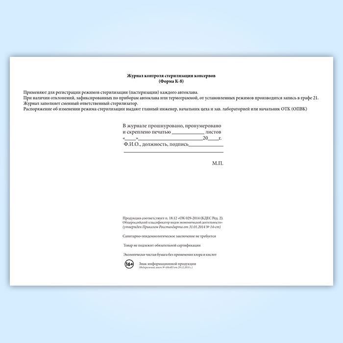 Журнал контроля стерилизации консервов (форма К-8) в Бердске купить