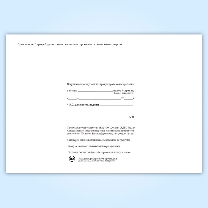 Вы получаете печатную продукцию прошнурованной и c местом для вашей печати в соответствии с действующими нормативными документами: