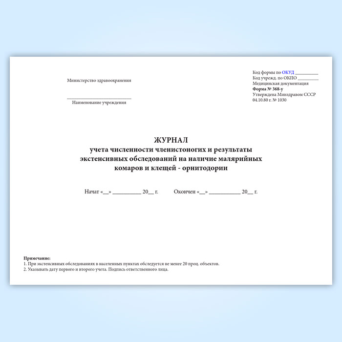 Журнал учета численности членистоногих и результаты экстенсивных обследований на наличие малярийных комаров и клещей - орнитодории (форма № 368-у) в Бердске купить