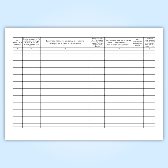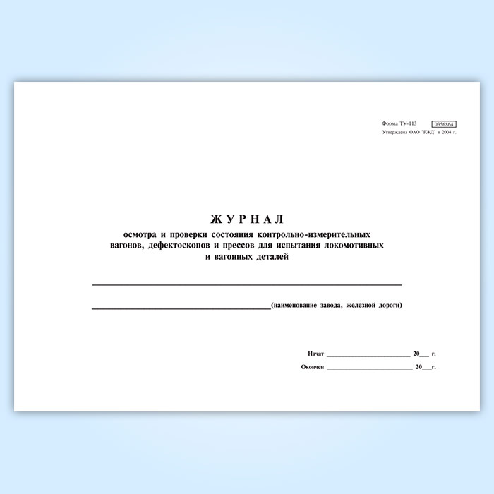 Журнал осмотра и проверки состояния контрольно-измерительных вагонов, дефектоскопов и прессов для испытания локомотивных и вагонных деталей (форма ТУ-113) в Бердске купить