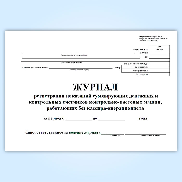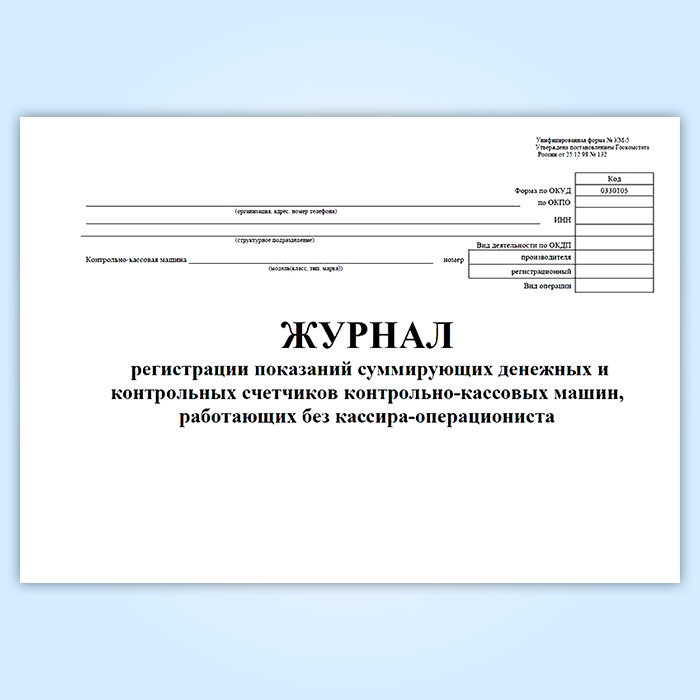 Журнал регистрации показаний суммирующих денежных и контрольных счетчиков контрольно-кассовых машин, работающих без кассира-операциониста (форма КМ-5) в Бердске купить