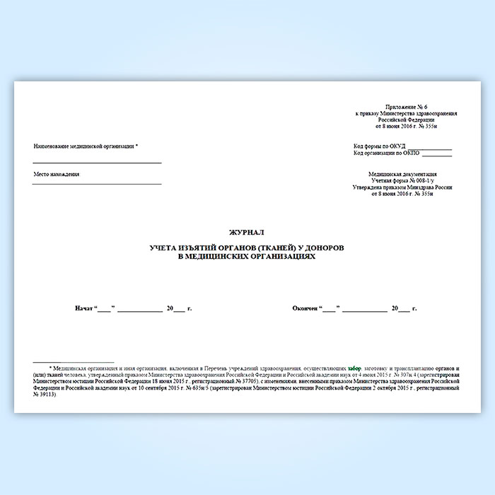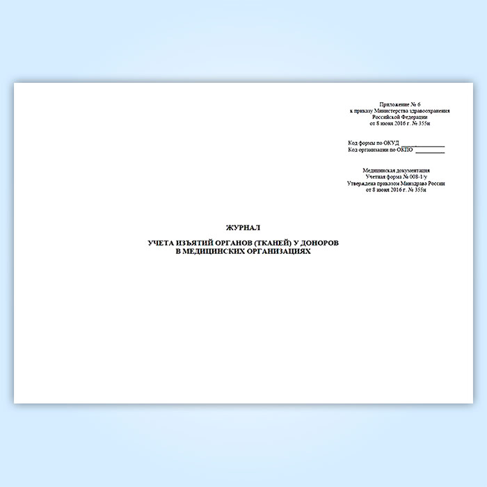 Журнал учета изъятий органов (тканей) у доноров в медицинских организациях (форма № 008-1/у) в Бердске купить
