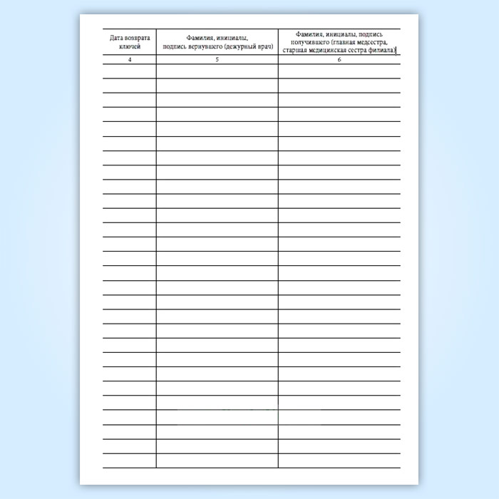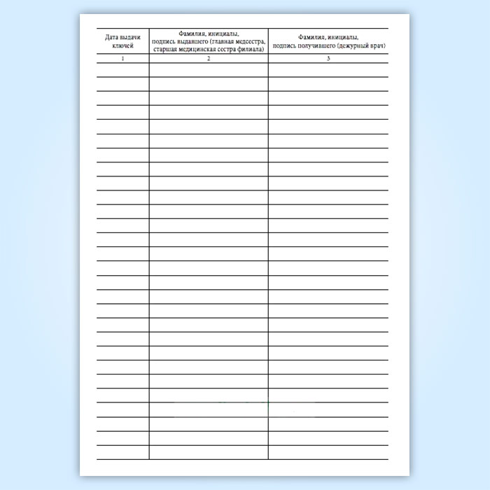 Журнал передачи ключей главной медсестры (старшей медицинской сестры филиала) дежурным врачам от помещения и сейфа, где проводятся операции, связанные с оборотом наркотических средств и психотропных веществ, в выходные и праздничные дни в амбулаторном отделении медицинской организации в Бердске купить