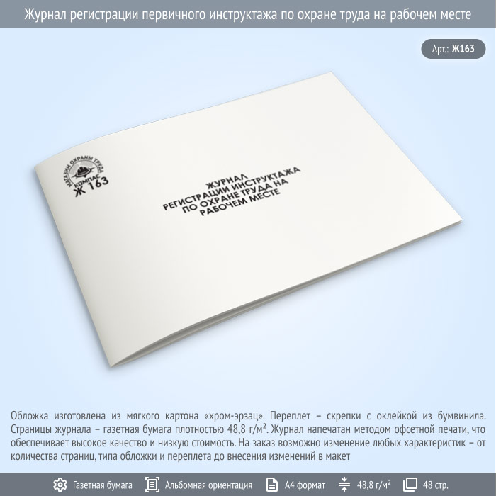 Журнал регистрации первичного инструктажа по охране труда на рабочем месте (Ж163, 48 стр.) в Бердске купить
