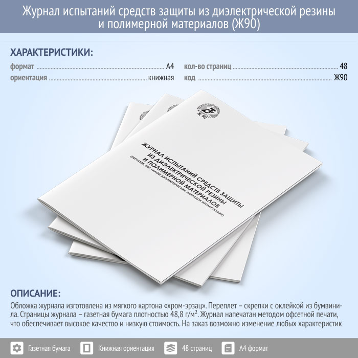Журнал испытаний средств защиты из диэлектрической резины и полимерных материалов (48 стр., Ж90) в Бердске купить